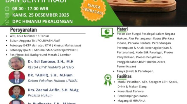 PANTURA24.COM, KOTA PEKALONGAN – Dewan Pimpinan Cabang (DPC) Himanu Kota Pekalongan bersiap menggelar pelatihan paralegal […]